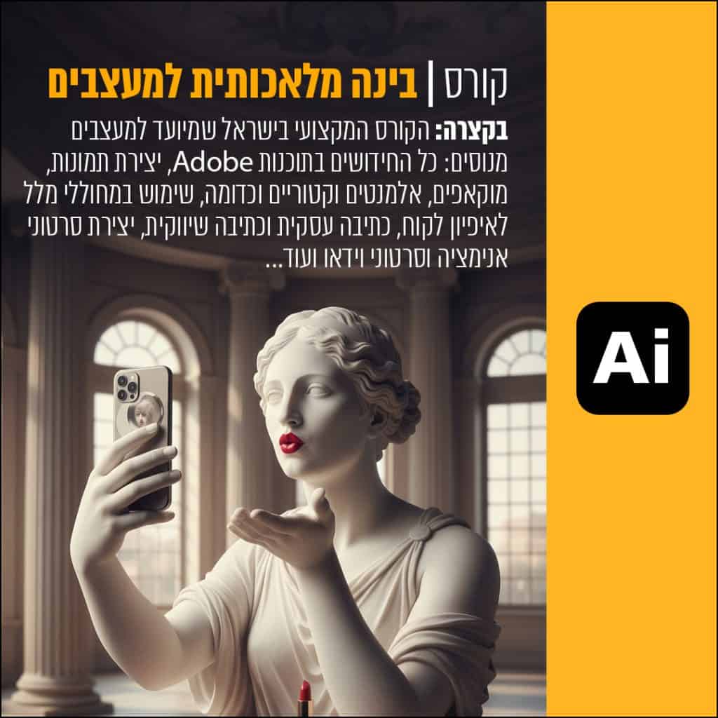 אל תישארו מאחור. הצטרפו עכשיו לקורס המוביל בישראל, שתוכנן על ידי אנשי המקצוע המובילים בתחום ומעצבים גרפיים ממגוון תחומים. בואו ללמוד כיצד ניתן לחסוך הרבה זמן והרבה כסף באמצעות שליטה במגוון כלי AI, כולל כל הפיצ’רים המתקדמים בחבילת תוכנות Adobe. הקורס מיועד למעצבים וגרפיקאים מכל התחומים: גרפיקה, דיגיטל, וידאו, מעצבי ממשקים, מפתחי משחקים ועוד. העתיד של העיצוב מתחיל כאן.